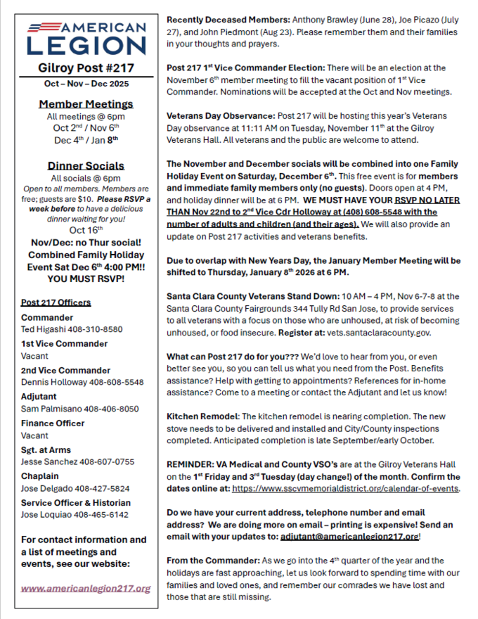 16 - Social, 6:00 pm. Please RSVP to 2nd Vice Commander by Oct 9th!